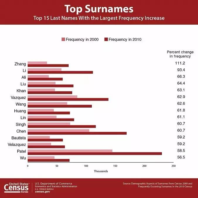 美國人口調查局發(fā)布了一份1990-2010年間美國人姓氏的變化趨勢,有趣的是最常見的姓前三名排序完全一樣,分別是史密斯(Smith)、約翰遜(Johnson)和威廉姆斯(Williams)。增長最快的15個姓氏中,中國的姓氏占了8席,其中Zhang和Li更是位列前兩名,其他中國姓氏還包括Liu、Wang、Huang、Lin、Chen和Wu。(美通社,2016年12月15日華盛頓)