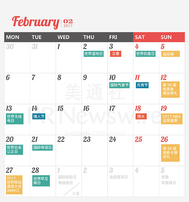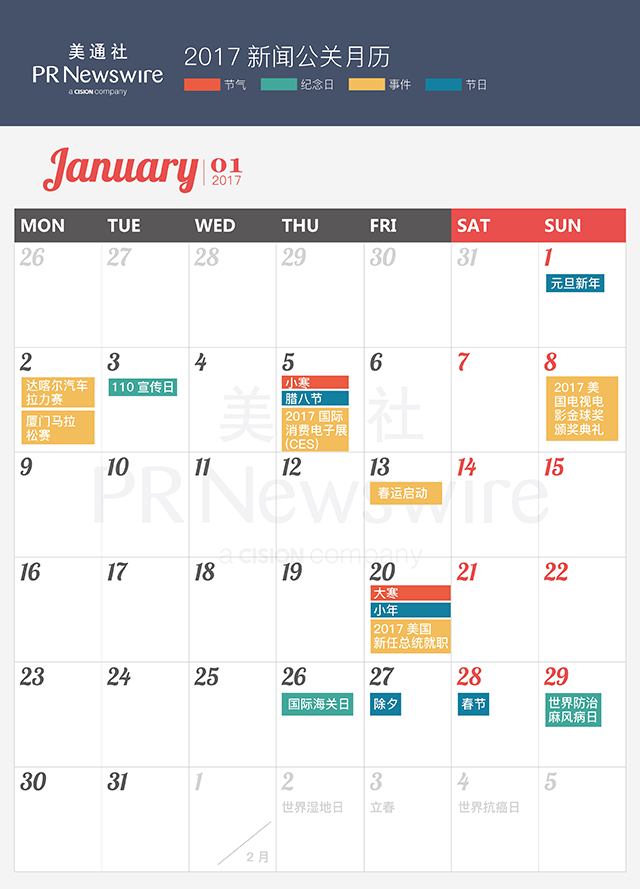 2017年馬上到來,美通社連續(xù)第四年推出新聞公關(guān)月歷,收錄了2017年度共292個重要節(jié)日、紀(jì)念日和新聞事件,線上PC版和手機版實時更新重要的會議活動信息,點擊原文搶先收藏!