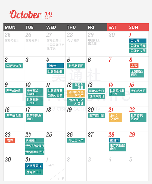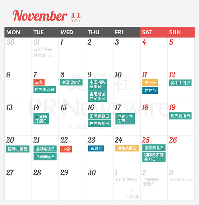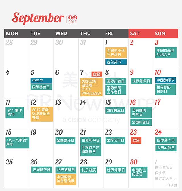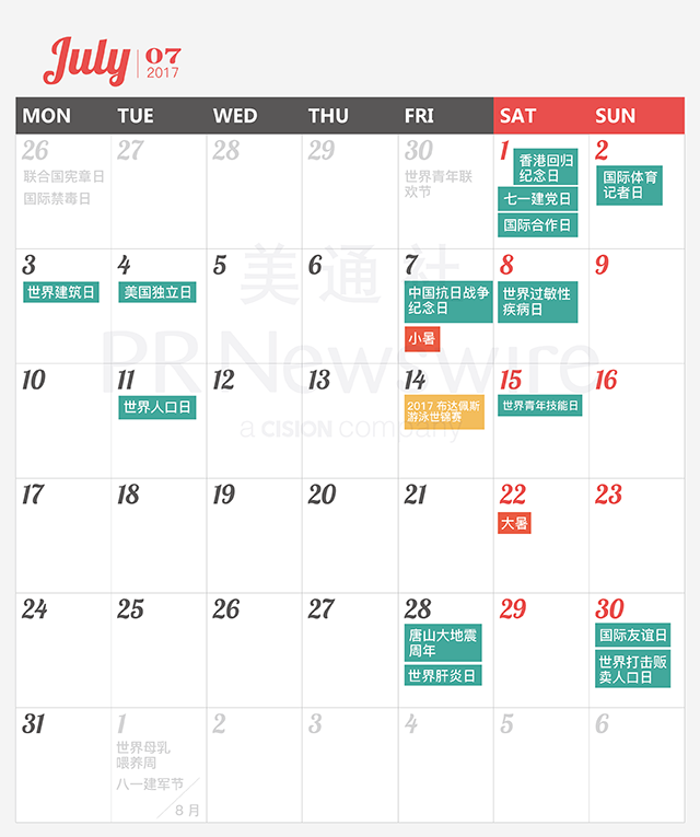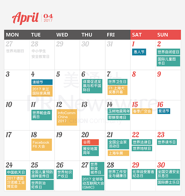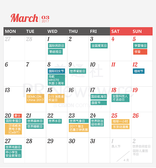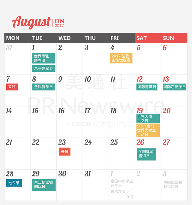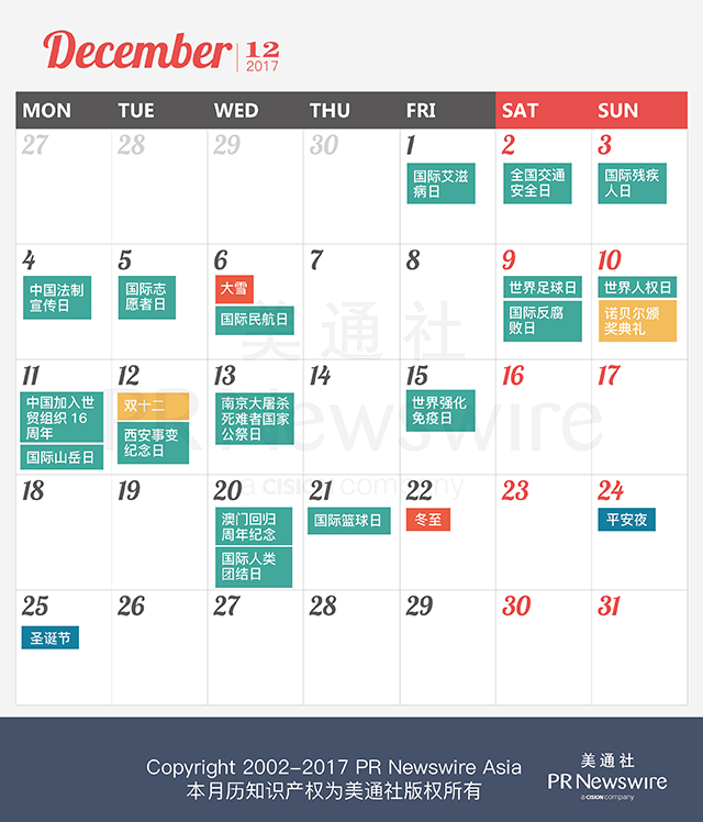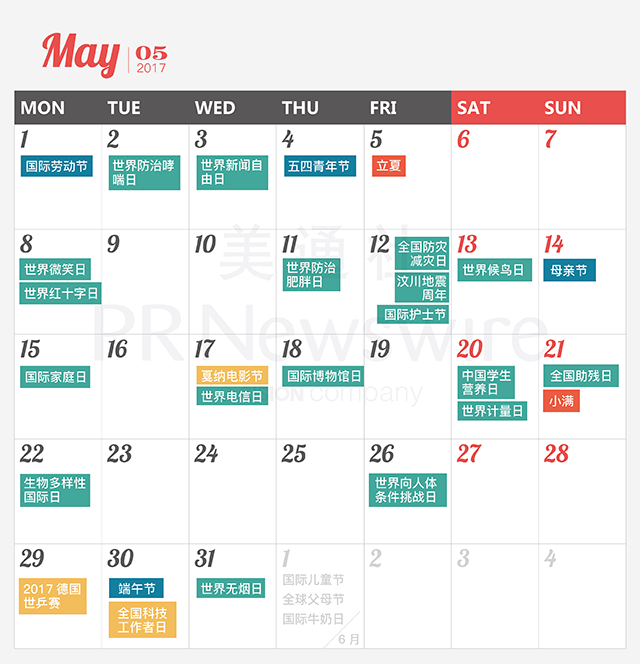 *美通社自2014年起開始推出新聞公關(guān)月歷,本月歷所有知識產(chǎn)權(quán),包括創(chuàng)意、文字、圖片設(shè)計、印刷、原創(chuàng)插畫等版權(quán)歸美通社(PR Newswire)所有,轉(zhuǎn)載請聯(lián)絡(luò)美通社,標(biāo)明原創(chuàng)出處。