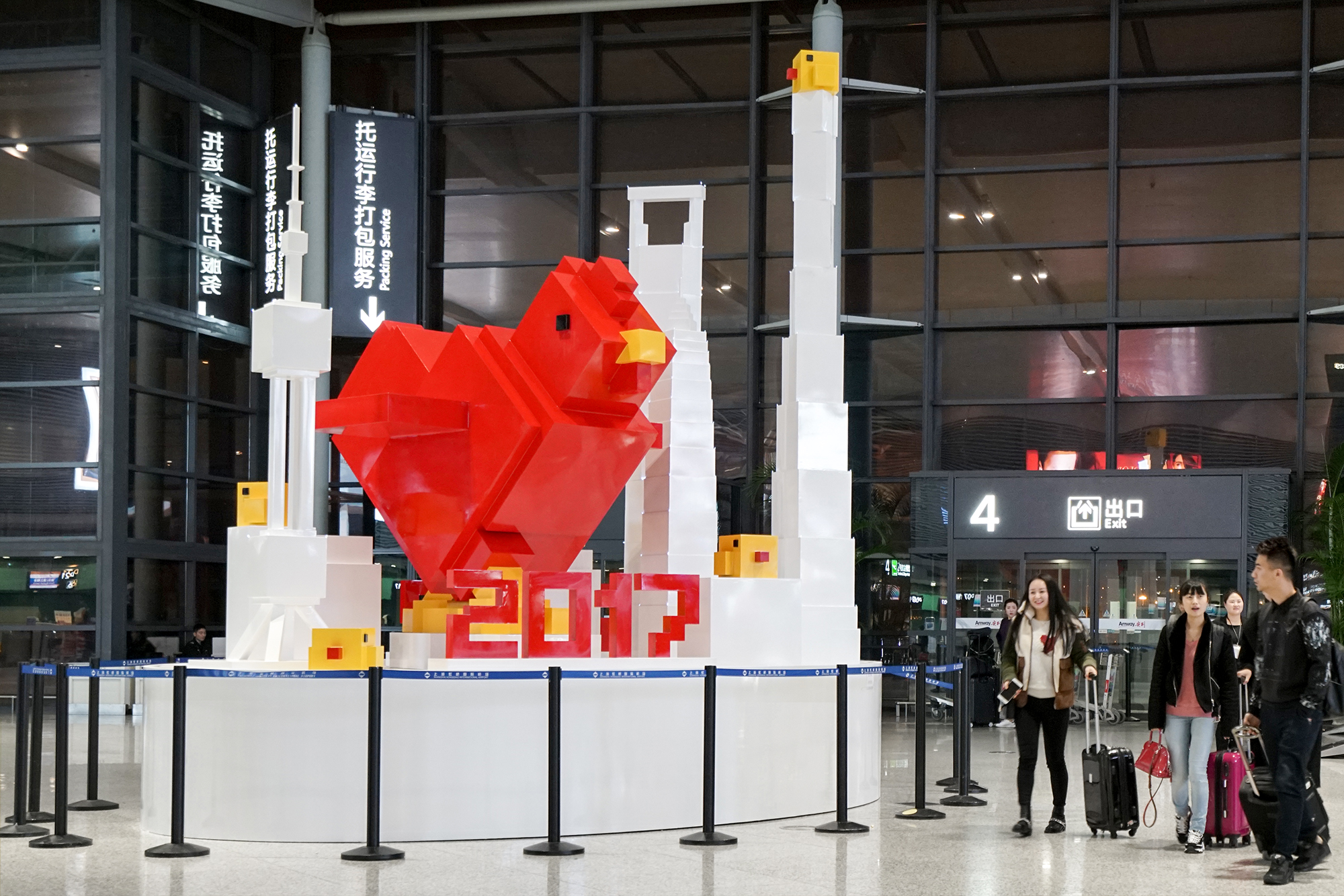 在上海虹橋國際機(jī)場2號航站樓出發(fā)及到達(dá)大廳,一組由上海機(jī)場德高動量廣告有限公司策劃的方塊像素丁酉年“飛雞”藝術(shù)雕塑群吸引了很多人的目光。兩組藝術(shù)雕塑群分別位于到達(dá)大廳行李提取處南北兩側(cè),可愛的“飛雞爸爸”和“小黃雞寶寶們”的家庭組合,令每一位在春運(yùn)期間抵達(dá)虹橋機(jī)場的乘客都能感受到新年氛圍和回家的溫馨,活潑伶俐地展現(xiàn)了酉雞年新春主題。(美通社,2017年1月16日上海)