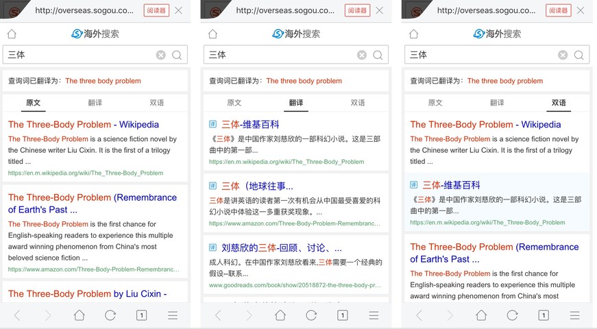 近日,搜狗將英文搜索全面升級(jí)為海外搜索,旨在幫助不精通英文的中國(guó)人搜索和閱讀全世界的醫(yī)療、科技及人文信息。用戶無(wú)論輸入中文還是英文,搜索結(jié)果在英文原文呈現(xiàn)外,新增了中文翻譯、中英雙語(yǔ)兩大頁(yè)面,服務(wù)于不精通英文的用戶。這是搜狗把深度神經(jīng)元網(wǎng)絡(luò)翻譯系統(tǒng)與搜索相結(jié)合打造的全新產(chǎn)品,也是全球首個(gè)提供功能的搜索引擎。(美通社,2017年1月17日北京)