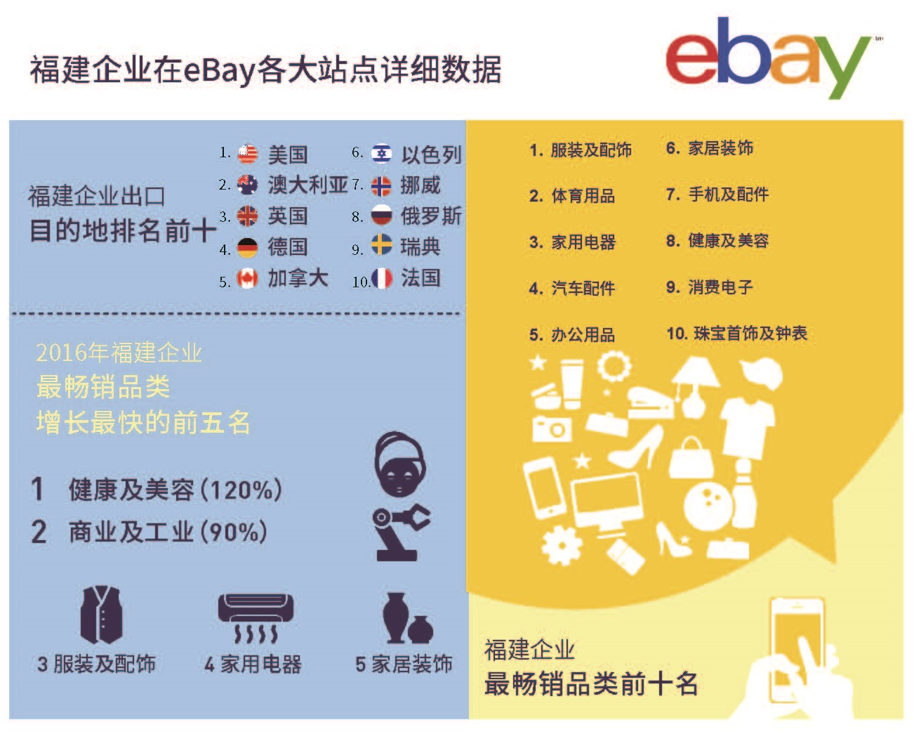 eBay與福建省商務廳、福州市人民政府共同簽署了戰(zhàn)略合作協(xié)議。三方將攜手合作實現(xiàn)優(yōu)勢資源整合,重點推動福建省跨境電商出口產(chǎn)業(yè)在政策扶植、人才培養(yǎng)、產(chǎn)業(yè)優(yōu)化和物流基建等領域的創(chuàng)新發(fā)展。據(jù)eBay內(nèi)部數(shù)據(jù)顯示, 在2016年,福建跨境電商零售出口企業(yè)通過eBay平臺將產(chǎn)品出口至200多個國家和地區(qū),其中,排名前三的出口目的地市場分別為美國、澳大利亞和英國。在暢銷品類方面,服飾配件、體育用品、家用電器、汽配和辦公用品分別居銷售榜前五位。(美通社,2017年4月7日福州)