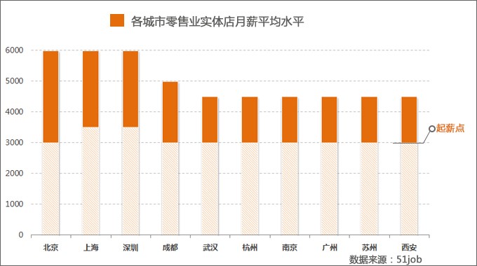 從城市來比較,各一線及準(zhǔn)一線城市零售業(yè)店員平均工資差距不大,區(qū)間均在3-5K/月,像北京、上海、深圳這樣的超大型一線城市,平均工資可以達(dá)到每月6K。