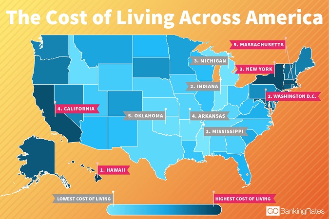 美國財(cái)經(jīng)網(wǎng)站GOBankingRates的一項(xiàng)調(diào)查顯示,美國生活成本最高的五個(gè)州分別是夏威夷州、哥倫比亞特區(qū)、紐約州、加州以及馬薩諸塞州,而生活成本最低的五個(gè)州則分別是密西西比州、印第安納州、密歇根州、阿肯薩斯州以及俄克拉荷馬州。這項(xiàng)排名是綜合比較各州房價(jià)、日用品、水電氣、交通、健康醫(yī)療以及各種雜項(xiàng)開支后得出的。值得一提的是,房價(jià)方面,華盛頓特區(qū)要比全美平均房價(jià)高出134%,成為美國房價(jià)最貴的地區(qū),加州緊隨其后,高出全國平均水平92.7%。(美通社,2017年5月11日洛杉磯)