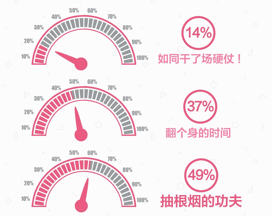 男性健康領(lǐng)導(dǎo)品牌之一“必利勁”聯(lián)合多家醫(yī)藥電商平臺(tái)開展了一場(chǎng)男性持久度調(diào)查。本次調(diào)查主要是針對(duì)各大醫(yī)藥電商超過(guò)1000位曾經(jīng)購(gòu)買過(guò)男科產(chǎn)品的會(huì)員。結(jié)果顯示,70%的調(diào)查對(duì)象認(rèn)為“為愛情鼓掌”是生活中自己最在意的事情。但“鼓掌”的過(guò)程似乎不盡如人意:有近4成的調(diào)查對(duì)象表示自己的這個(gè)過(guò)程也就是翻個(gè)身的功夫,說(shuō)明時(shí)間較短,滿意度較低。