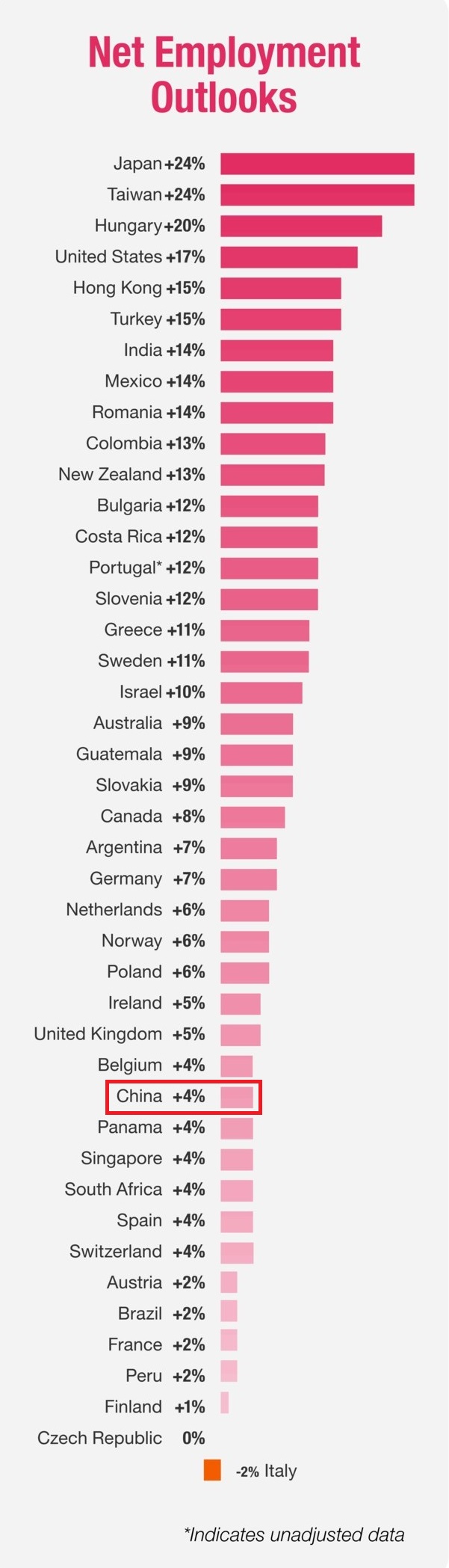 萬寶華盛ManpowerGroup最新的雇傭前景調(diào)查顯示,2017年第三季度,受調(diào)查的43個地區(qū)中,有41個地區(qū)的雇主計劃擴(kuò)大招聘。其中,招聘意愿最強(qiáng)烈的地區(qū)是日本、臺灣、匈牙利和美國,而意大利、捷克、芬蘭等地的雇主招聘意愿最低。亞太地區(qū),中國和新加坡兩地的雇主招聘意愿最低。(美通社,2017年6月11日洛杉磯)