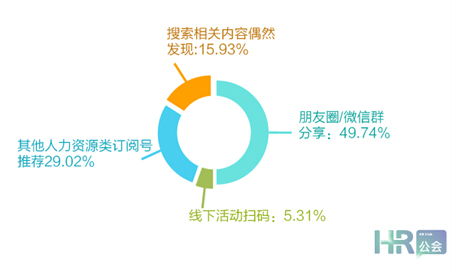 參與調(diào)研的人群中,人力資源專員/主管占比68.36%,人力資源經(jīng)理/總監(jiān)及以上級(jí)別占比31.64%,其中有49.74%的受訪者表示通過朋友圈獲取人力資源相關(guān)信息的。看來,朋友圈除了提供“點(diǎn)贊之交”外,還是分享知識(shí)的重要平臺(tái)。