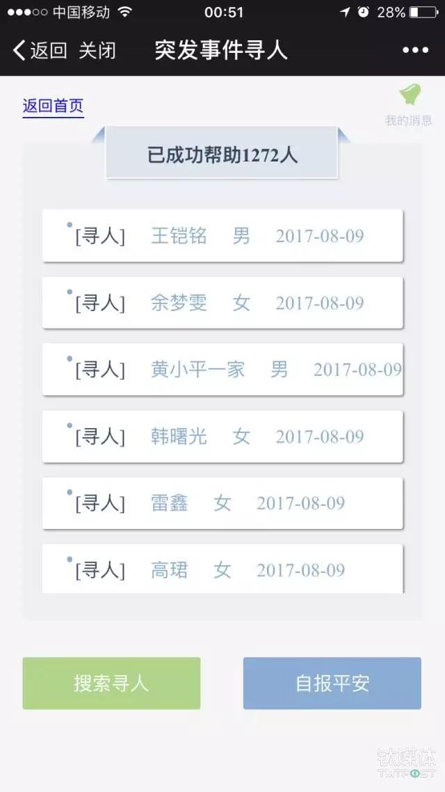 這個(gè)動(dòng)作在此次九寨溝縣地震中被“今日頭條”率先承擔(dān),在昨晚的今日頭條 APP 與微信公眾號(hào)里,接連推出“地震尋人服務(wù)”的 H5頁(yè)面,通過(guò)朋友圈轉(zhuǎn)發(fā)與今日頭條本身的流量入口,提供“搜索尋人”與“自報(bào)平安”兩大功能,而在上線的當(dāng)晚,該頁(yè)面已經(jīng)為1272人提供了相應(yīng)服務(wù)。