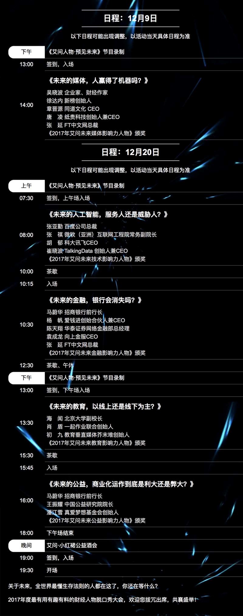 2017年艾問人物峰會暨《預(yù)見未來》電視論壇定于12月20日于北京舉辦,科大訊飛總裁胡郁、雨果獎作家郝景芳、FT中文總裁張延、中國公益研究院院長王振耀等二十多名大咖也將同臺激辯十年后的新金融、新公益、新技術(shù)、新教育,定義“萬變世界里的不變法則”!2017年度艾問峰會電視論壇暨小紅裙公益酒會,遇見彼此預(yù)見未來!