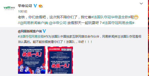 隨著法國隊和克羅地亞隊進(jìn)入到世界杯決賽,圍繞世界杯所進(jìn)行的全民狂歡也進(jìn)入到了最高潮階段。先是蒙牛“我不是天生強(qiáng)大,我只是天生要強(qiáng)”,然后有華帝“法國隊奪冠華帝退全款”,不斷激發(fā)了全民參與的積極性。7月12日,一直“各有態(tài)度”的網(wǎng)易也加入其中,“法國奪冠網(wǎng)易放假”成為今天的社交媒體新熱點(diǎn)。