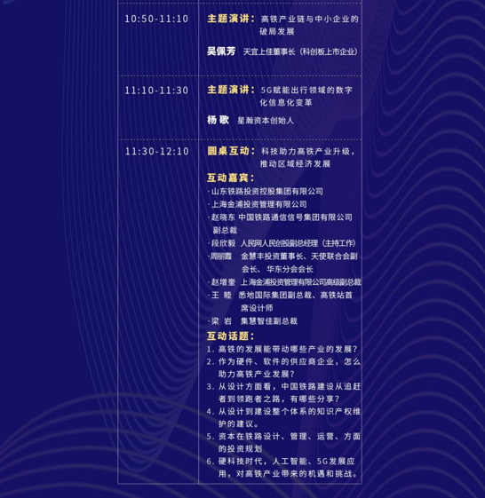 峰會將圍繞高鐵網(wǎng)絡(luò)與城市產(chǎn)業(yè)規(guī)劃、高鐵產(chǎn)業(yè)鏈與中小企業(yè)的破局、區(qū)域中心城市在產(chǎn)業(yè)升級中的投資機(jī)會等主題展開探討,邀請國內(nèi)一線投資機(jī)構(gòu)投資人、上市企業(yè)董事長等行業(yè)專家作主題分享,會議還將設(shè)置圓桌互動、在線交流等環(huán)節(jié),議程豐富,形式多樣。