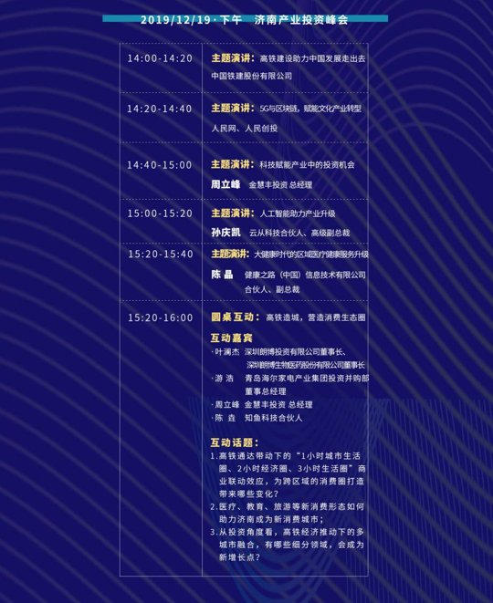 高鐵新時代,產(chǎn)業(yè)新未來。在山東新舊動能轉(zhuǎn)換的關(guān)鍵期,大批新舊動能轉(zhuǎn)換重點項目需要大量資金,大批產(chǎn)業(yè)升級項目需要新技術(shù),資金、資源、技術(shù)、人才都為山東和濟(jì)南所急需。在這樣的背景下,2019高鐵·智見濟(jì)南產(chǎn)業(yè)投資峰會也將于2019年12月19日在濟(jì)南魯能希爾頓酒店舉行。