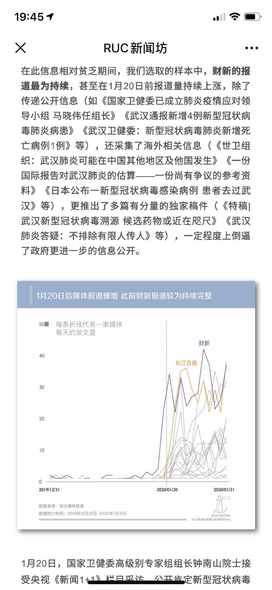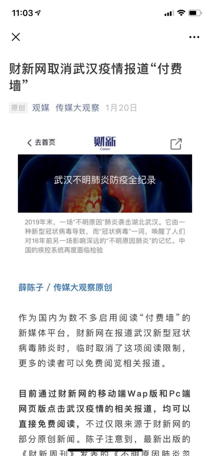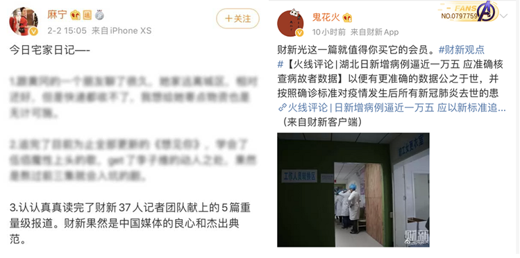 在新冠肺炎疫情的報(bào)道過(guò)程中,以財(cái)新為代表的部分媒體體現(xiàn)出專業(yè)新聞媒體的責(zé)任與擔(dān)當(dāng)。重大事件的報(bào)道,財(cái)新團(tuán)隊(duì)從不缺席。網(wǎng)友這樣評(píng)論他們:
