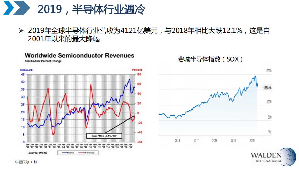 王林介紹,從2019年開始,半導(dǎo)體行業(yè)就進(jìn)入了一種疲軟狀態(tài)。統(tǒng)計(jì)數(shù)據(jù)顯示,受整個(gè)行業(yè)周期性下滑的影響,2019年全球半導(dǎo)體行業(yè)營(yíng)收為4121億美元,與2018年相比大跌12.1%,創(chuàng)下了2001年以來的最大降幅。同時(shí)2020年開年,受疫情影響,Gartner再度下調(diào)對(duì)2020半導(dǎo)體產(chǎn)業(yè)營(yíng)收的預(yù)期,調(diào)低了108億美元。
