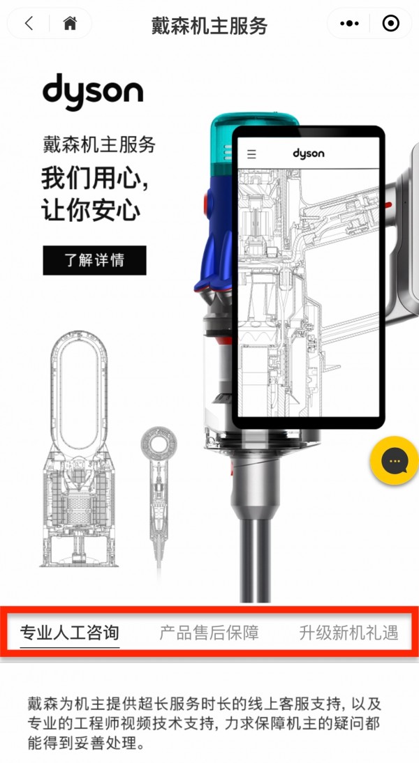 打開Dyson小程序,可以看見「戴森機主服務」,其中提供專業(yè)人工咨詢、產(chǎn)品售后保障、升級新機禮遇。比如,針對用戶使用過程中的“疑難雜癥”,戴森提供了遠程視頻維修工程師服務(Virtual Service Engineer,簡稱VSE),讓消費者足不出戶就能通過遠程視頻,獲得戴森工程師的一對一專業(yè)指導。