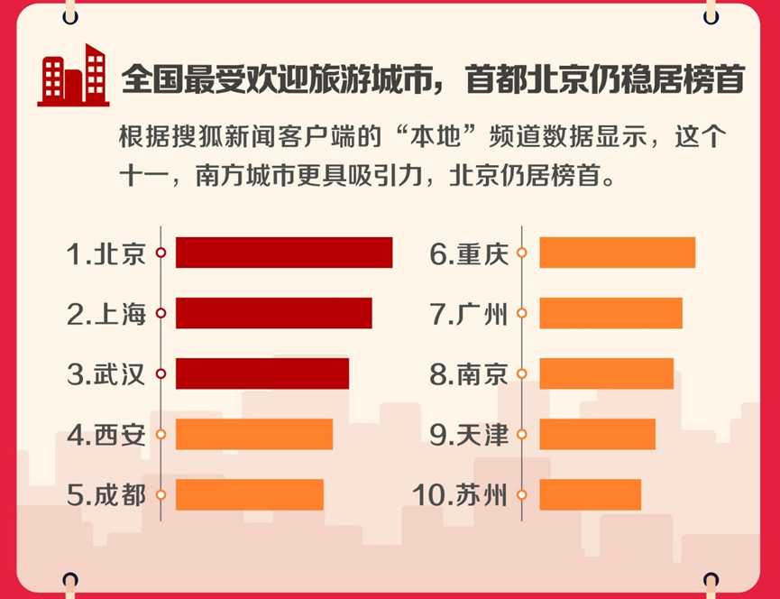 搜狐新聞客戶端還充分挖掘“本地頻道”數(shù)據(jù),通過(guò)數(shù)據(jù)處理和分析,探知數(shù)據(jù)背后隱藏的規(guī)律,抑或用戶擔(dān)憂的社會(huì)問(wèn)題。報(bào)告顯示,全國(guó)最具吸引力的旅游城市包括北京、上海、廣州和成都等城市;有趣的是,這些最受歡迎旅游城市的市民比其他城市更加關(guān)注“十一長(zhǎng)假”的相關(guān)信息,似乎更想“出去看看”,正所謂“外面的人想進(jìn)來(lái),里面的人想出去”。與此同時(shí),“堵車(chē)”“臺(tái)風(fēng)”“霧霾”“黃色預(yù)警”等負(fù)面詞匯也登上新聞熱搜排行榜,說(shuō)明用戶在策劃旅行路線的同時(shí)也為交通和天氣問(wèn)題擔(dān)憂。