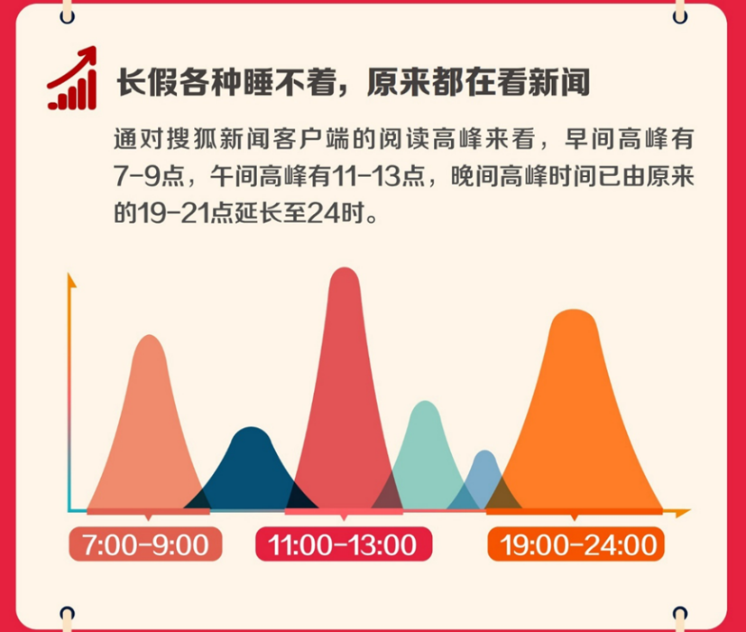 搜狐新聞客戶端不僅滿足于對(duì)用戶數(shù)據(jù)的靜態(tài)分析,還十分重視對(duì)用戶閱讀時(shí)段的階段性研究和趨勢(shì)分析。報(bào)告顯示,國(guó)慶期間用戶的閱讀高峰段出現(xiàn)延長(zhǎng)的變化,說(shuō)明用戶的閱讀需求增大。為此,搜狐新聞客戶端通過(guò)“混合推薦”、“垂直標(biāo)簽”和“搜索閱讀”等功能,對(duì)相應(yīng)時(shí)段的新聞推送做出了及時(shí)的增加和調(diào)整,立足于用戶特定時(shí)期的閱讀需求,為用戶提供全面科學(xué)的參考。