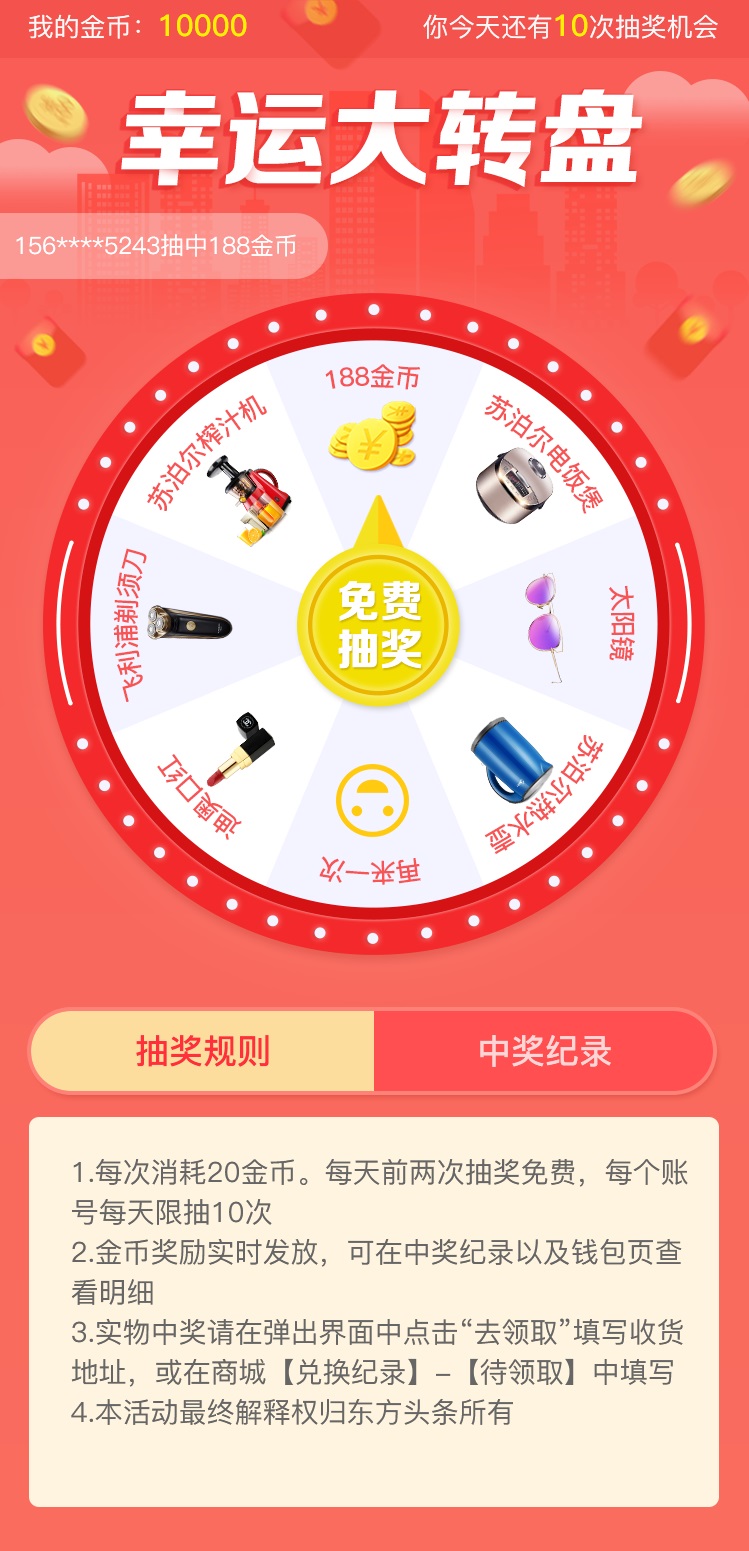 用戶(hù)在東方頭條平臺(tái),通過(guò)閱讀、評(píng)論、分享內(nèi)容或邀請(qǐng)好友獲取的金幣,均可參與“幸運(yùn)大轉(zhuǎn)盤(pán)”抽獎(jiǎng)活動(dòng),每消耗20枚金幣可兌換一次抽獎(jiǎng)機(jī)會(huì),月餅禮盒、陽(yáng)澄湖大閘蟹及干紅葡萄酒等好禮繽紛上場(chǎng)。