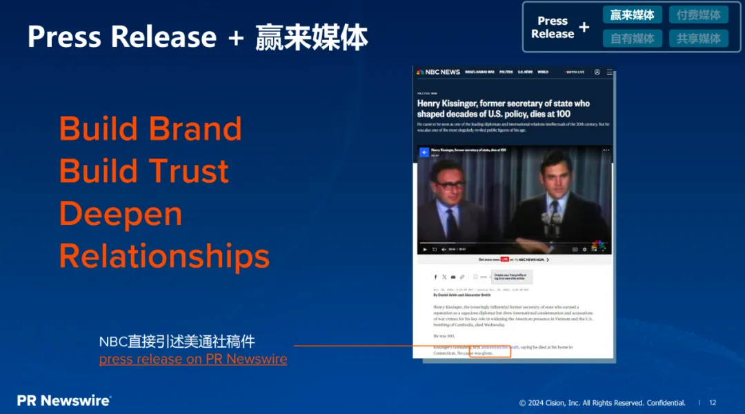 用案例來說。去年年底美國(guó)的外交官基辛格去世時(shí),權(quán)威媒體NBC News在報(bào)道這種突發(fā)性新聞的時(shí)候,直接引用了美通社發(fā)布的官宣稿件,這種經(jīng)由正規(guī)新聞發(fā)布機(jī)構(gòu)發(fā)布的內(nèi)容,自然更容易贏得權(quán)威媒體的關(guān)注與信任。