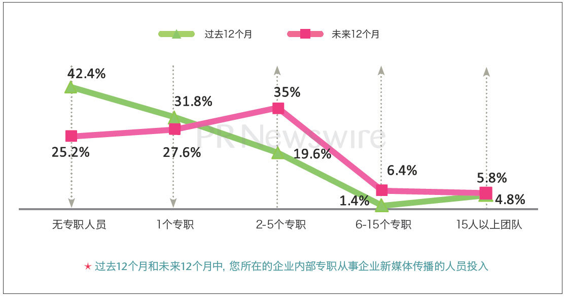 - 在過去和未來的12個(gè)月內(nèi),企業(yè)對(duì)新媒體專職人員的投入需求同比增長(zhǎng)一倍