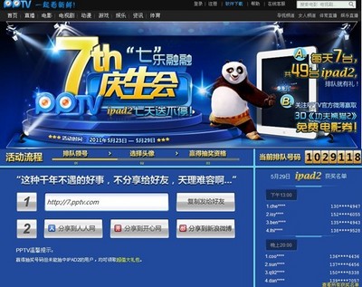 第三階段:已經(jīng)邀請3位好友成功安裝 PPTV2.6新版本客戶端的網(wǎng)友們,還能獲得參加“造星”大獎的抽獎機會。同時還有機會抽取新上市的 iPad 和百元購物卡等其他獎項。