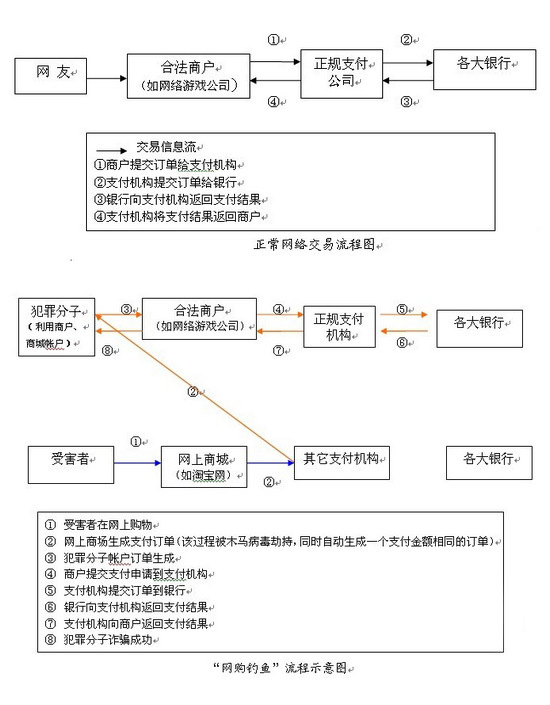 示意圖如上(如圖所示,“正規(guī)支付機構”兩端的流程都是正常流程,無法分辨是騙子還是受害者;但“網(wǎng)上商城”、“合法商戶”有責任追索到騙子):