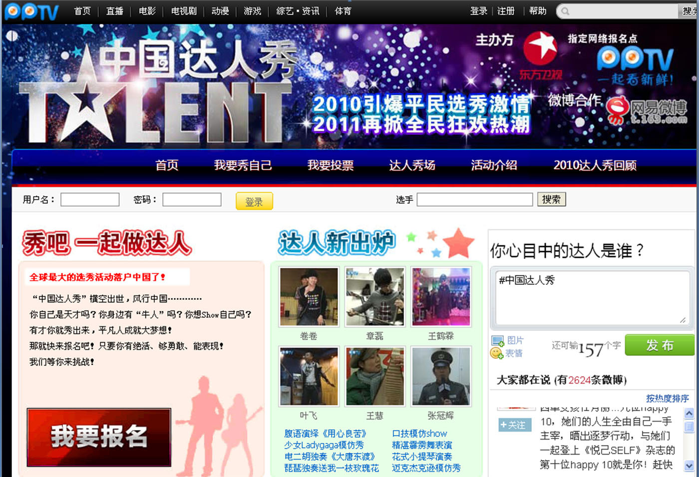 PPTV 網(wǎng)絡(luò)電視中國(guó)達(dá)人秀網(wǎng)絡(luò)報(bào)名地址:http://drx.pptv.com/2011/