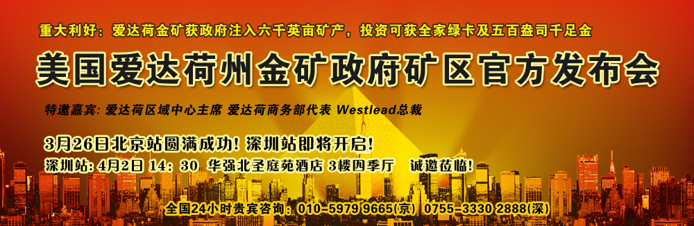北京2011年3月29日電 /美通社亞洲/ -- 世通(北京)出入境有限公司將于2011年4月2日14:30在深圳舉辦美國(guó)投資移民精品項(xiàng)目-美國(guó)愛達(dá)荷州金礦項(xiàng)目發(fā)布會(huì)。