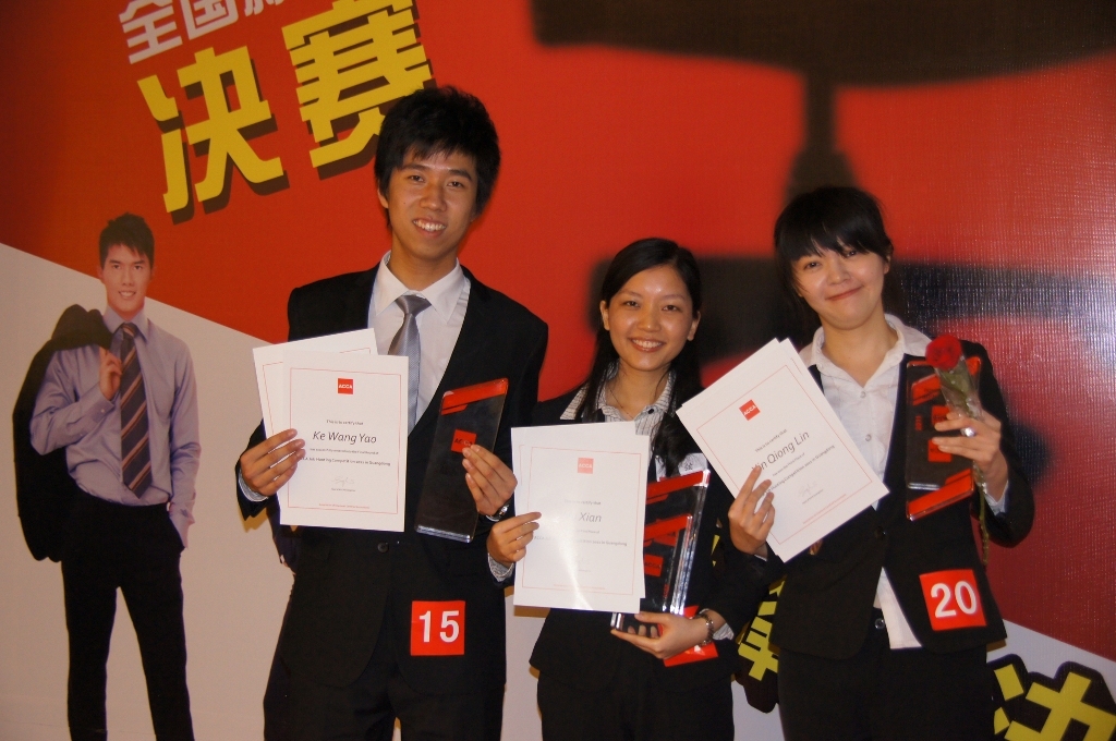 胡弦同學(xué)是暨南大學(xué)國際學(xué)院的大三學(xué)生,在班級中成績排名在前2%。她出眾英語能力深受評委們贊賞,此前還曾獲得廣東省大學(xué)生英語演講比賽第一名和全國 CCTV 英語演講比賽優(yōu)勝獎(jiǎng)。決賽之前,她就曾經(jīng)在4月16日 ACCA 就業(yè)力大比拼前20選手“職業(yè)訓(xùn)練營”的人際交往練習(xí)環(huán)節(jié)中獲得選手們共同票選的第一名。當(dāng)時(shí)選手們的職業(yè)訓(xùn)導(dǎo)導(dǎo)師程煜麟先生總結(jié)了選手們的意見,認(rèn)為胡弦獲勝的原因在于她在與人交談時(shí)始終表現(xiàn)出淡定、大方、誠懇和自信,讓與之交談的人感覺如沐春風(fēng)。亞軍柯汪堯同學(xué)也是一名大三學(xué)生,現(xiàn)就讀于廣東外語外貿(mào)大學(xué)國際商務(wù)英語學(xué)院國際貿(mào)易專業(yè),他在密鑼緊鼓準(zhǔn)備比賽的同時(shí)還在廣交會實(shí)習(xí),毅力過人的他克服了時(shí)間的困難,帶領(lǐng)比賽團(tuán)隊(duì)出色地完成項(xiàng)目,最終以成熟自信的表現(xiàn)獲得評委一致好評。與亞軍來自同一學(xué)院的辛瓊璘同學(xué)是國際商務(wù)(全英班)的學(xué)生,她親切大方的形象、良好的團(tuán)隊(duì)合作精神和敏捷的才思令評委們留下深刻印象。