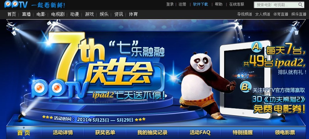 上海2011年5月20日電 /美通社亞洲/ -- PPTV 網(wǎng)絡(luò)電視正式步入7年發(fā)展新歷程,為感謝眾多忠實(shí)擁護(hù)者7年來(lái)的陪伴,大規(guī)模開展系列慶生活動(dòng)。5月23日 - 29日,一場(chǎng)以“PPTV‘七樂(lè)融融’慶生會(huì),7天 iPad2 送不?!睘橹黝}的線上排隊(duì)?wèi)c生抽獎(jiǎng)活動(dòng),在國(guó)內(nèi)火熱展開。通過(guò)每天7臺(tái),連續(xù)7天送出49臺(tái)新款蘋果 iPad2 為用戶禮物以及2000張(僅限北上廣三地) 3D 《功夫熊貓2》電影票,回饋一直以來(lái)支持 PPTV 網(wǎng)絡(luò)電視的用戶,與億萬(wàn)網(wǎng)民一同分享國(guó)內(nèi)首屈一指的網(wǎng)絡(luò)電視媒體7年成長(zhǎng)喜悅。(活動(dòng)官網(wǎng):http://7.pptv.com)