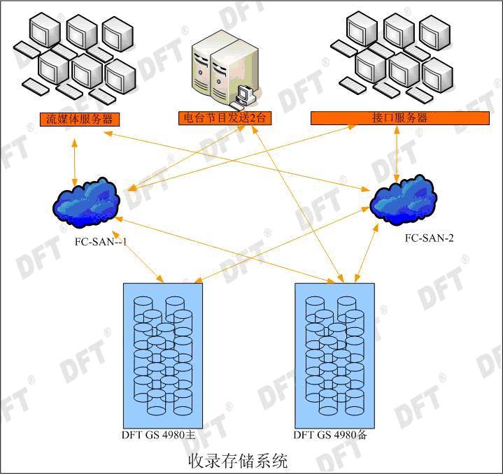 信息中心林主任表示:“在大樓建設初期,收錄系統(tǒng)中的數(shù)據(jù)都存儲在工作站中,安全問題存在很大隱患性,任何一臺服務器宕機,系統(tǒng)都將面臨數(shù)據(jù)全部丟失的風險。如何確保數(shù)據(jù)安全,成為新系統(tǒng)建設初期迫在眉睫需要解決的問題。根據(jù)客戶的特別要求,DFT 在其存儲解決方案中,存儲架構(gòu)采用全冗余設計,通過主備交換機,將數(shù)據(jù)存儲到DFT磁盤陣列中,保證了鏈路和數(shù)據(jù)的安全性。目前 DFT 存儲產(chǎn)品可以滿足收錄系統(tǒng)的需求,并且在帶寬上還略有余量?!蓖瑫r該存儲方案中又采用了 DFT GS 系列高端存儲產(chǎn)品,提供了滿足用戶需求的存儲帶寬,保障了存儲系統(tǒng)的穩(wěn)定性,提高了存儲系統(tǒng)高可用性。由于該產(chǎn)品還支持高達224TB 的存儲容量,為日后系統(tǒng)中增加節(jié)目提供了足夠的存儲空間,為整個收錄系統(tǒng)的穩(wěn)定運行提供了堅實的基礎。