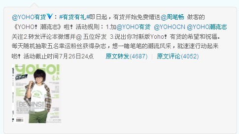 為了慶祝和宣傳 Begins 入駐 Yoho!有貨,早在7月20日,Yoho!有貨官方微博暨發(fā)起了轉(zhuǎn)發(fā)“Begins 入駐 Yoho!有貨,贈(zèng)送周筆暢封面雜志《Yoho!潮流志》“活動(dòng)。截止到今天共有4600多條轉(zhuǎn)發(fā),4000余條評(píng)論,加上此前發(fā)布的 Begins 正式入駐 Yoho!有貨新聞消息,共有5萬余人參與了微博的轉(zhuǎn)發(fā),評(píng)論量更是達(dá)到了3萬余條。沒想到粉絲們的力量是如此強(qiáng)大,正是借助于微博傳播,在周筆暢、Begins、Yoho 的貼吧粉絲們也是自覺將 Begins 的最新消息與其他筆迷們分享。