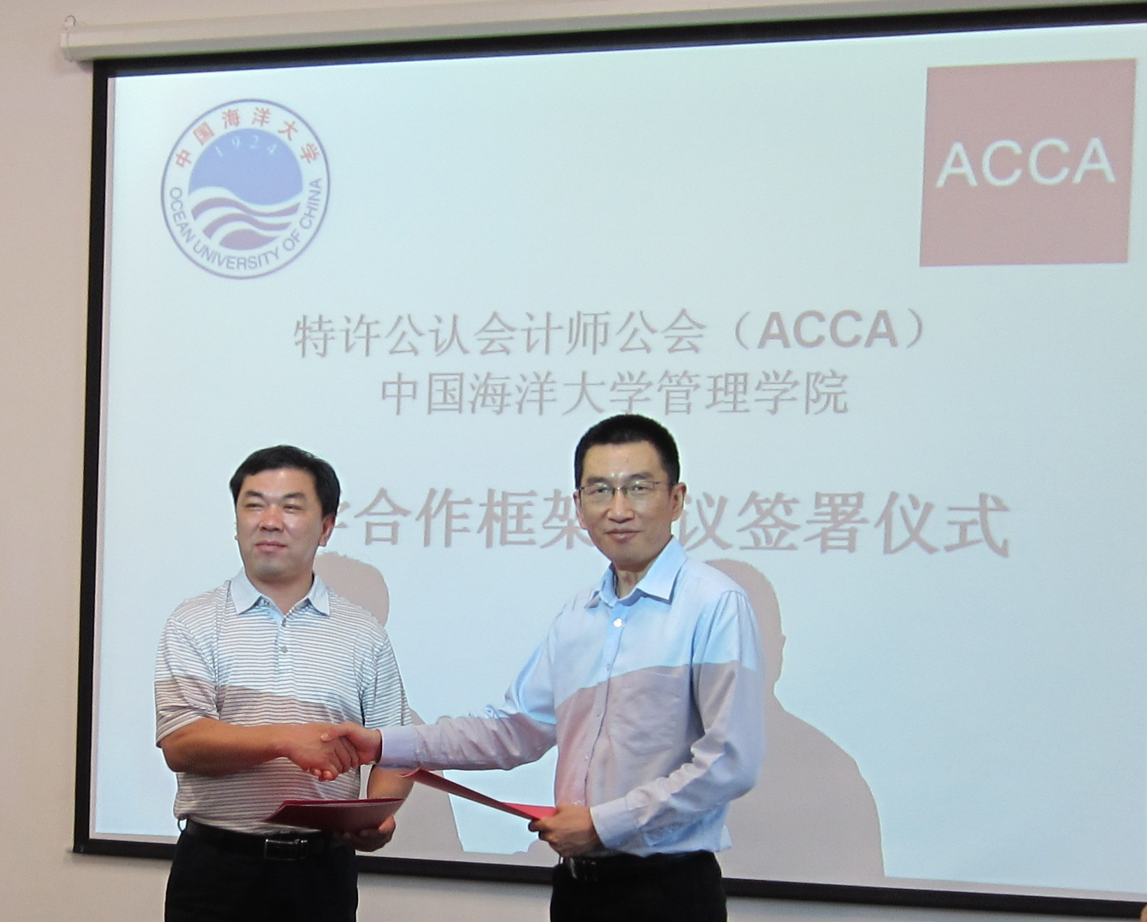 中國海洋大學(xué)管理學(xué)院教學(xué)合作框架協(xié)議”簽署儀式在中國海洋大學(xué)管理學(xué)院隆重舉行。ACCA 北京代表處首席代表于翔天先生與管理學(xué)院院長權(quán)錫鑒教授、副院長兼會(huì)計(jì)學(xué)系主任王竹泉教授等進(jìn)行了親切的會(huì)談并簽署了正式合作協(xié)議。根據(jù)協(xié)議,管理學(xué)院將 ACCA 國際財(cái)會(huì)資格課程嵌入到會(huì)計(jì)學(xué)專業(yè)本科教學(xué)中,計(jì)劃于2012年開始招收第一期 ACCA 方向班學(xué)員,培養(yǎng)緊缺的國際化高級(jí)財(cái)會(huì)人才。