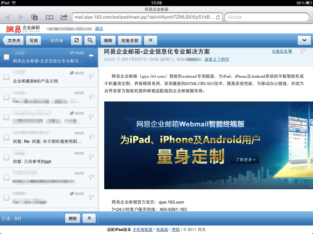 北京2011年9月13日電 /美通社亞洲/ -- 網(wǎng)易企業(yè)郵箱(qiye.163.com)宣布,Webmail智能終端版正式上線,該版本是網(wǎng)易企業(yè)郵箱為iPad、iPhone及Android系統(tǒng)的智能終端量身定制的,用戶直接通過(guò)瀏覽器登錄。該版本具有收發(fā)郵件快速、節(jié)省流量、占用手機(jī)內(nèi)存小等特點(diǎn),大大方便企業(yè)用戶進(jìn)行移動(dòng)辦公。網(wǎng)易也成為國(guó)內(nèi)首家為企業(yè)郵箱用戶提供適配版移動(dòng)智能終端的服務(wù)商。