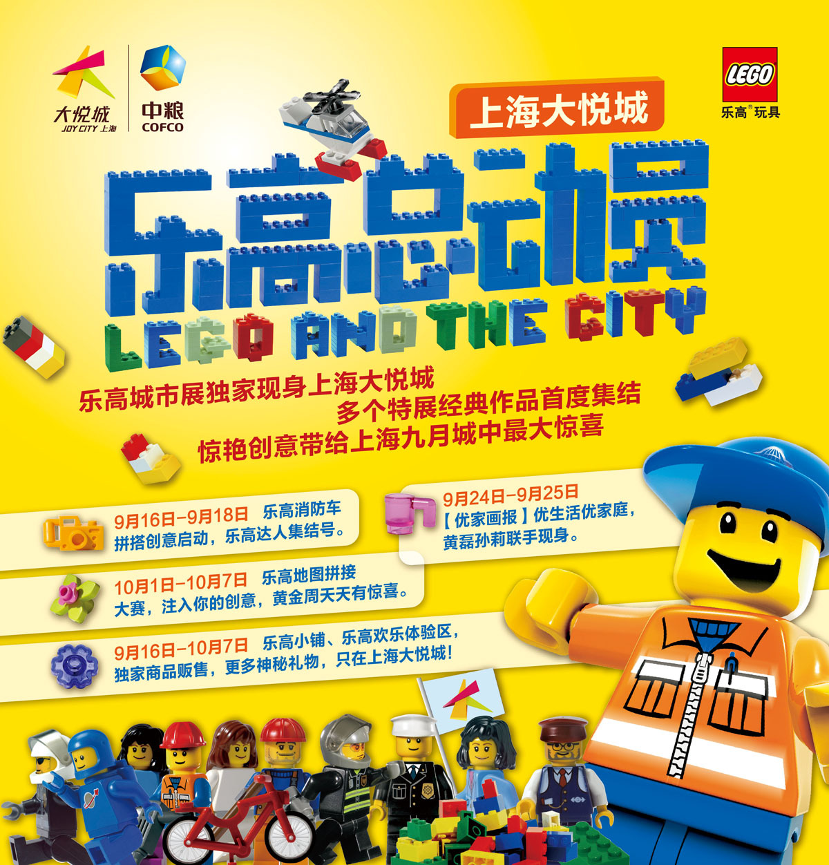 從9月中旬起到“十一黃金周”,樂高城市展將隆重登陸在上海大悅城。上海大悅城攜手樂高玩具,為忙碌的都市人開辟出一塊純真沒有壓力,可以自由放飛想象的空間。多個真人大小的樂高人偶將亮相上海大悅城,樂高亞洲風物志以及各種城市模型展覽一定讓來此參觀的朋友們大呼驚奇。在此期間,知名演員黃磊孫莉將一同現(xiàn)身樂高展現(xiàn)場,與大家一同游戲,感受樂高的精彩。樂高迷們更可趁此機會,再次擴大自己的“戰(zhàn)利品”,眾多樂高新奇玩具將一同亮相上海大悅城,機會不容錯過。同時樂高帶來了多樣限量版的產(chǎn)品,優(yōu)惠價格盡在樂高小鋪。