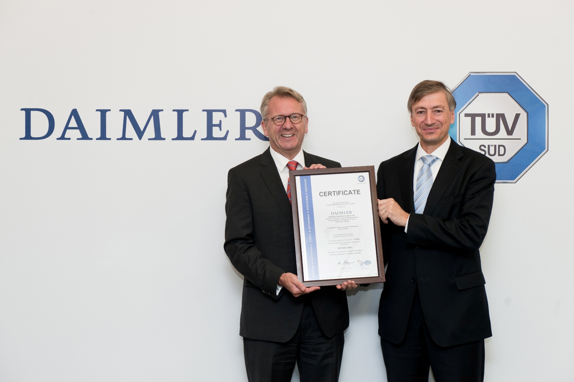 北京2011年9月20日電 /美通社亞洲/ --繼戴姆勒東北亞投資有限公司(以下簡稱戴姆勒東北亞)通過 TUV 南德意志集團(tuán)(以下簡稱TUV SUD)審核之后,VDA6.2: 2004認(rèn)證證書頒發(fā)儀式在北京戴姆勒大廈舉行。TUV SUD 管理服務(wù)股份有限公司 (TUV SUD Management Service GmbH) CEO:Peter Schaff 博士在儀式中向戴姆勒東北亞董事長兼首席執(zhí)行官華立新(Ulrich Walker)先生頒發(fā)了證書。TUV SUD 大中華集團(tuán)總裁兼 CEO 范華德(Dirk von Wahl)先生也參加了此次儀式。這是 TUV SUD 在亞洲地區(qū)首個頒發(fā)給汽車集團(tuán)的 VDA6.2證書,同時,戴姆勒東北亞旗下的6個子公司也各自獲得了相應(yīng)的業(yè)務(wù)證書,全面覆蓋了戴姆勒東北亞在中國大陸、臺灣、韓國的梅賽德斯-奔馳乘用車、商用車、汽車金融和零部件業(yè)務(wù)。