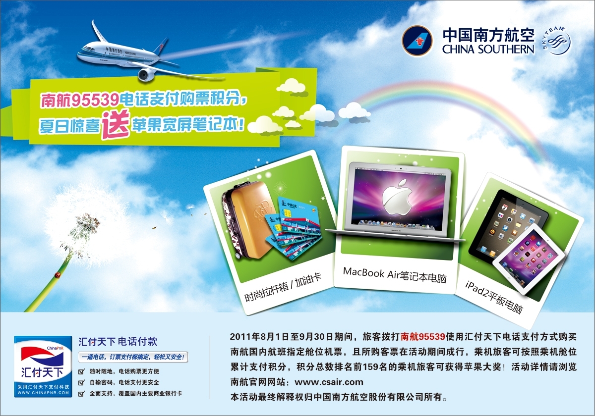 各大航空公司都在長假前推出了一系列購票優(yōu)惠活動。近日,中國南方航空為答謝廣大用戶,聯(lián)合金融級電子支付專家匯付天下帶來一場假日活動盛宴。即日起至2011年9月30日,撥打南航銷售服務(wù)熱線95539使用電話支付方式購買南航國內(nèi)航班指定艙位機(jī)票,乘客可按乘機(jī)艙位累計支付積分,積分總數(shù)排名前159名的乘客可獲得蘋果 MacBook Air 筆記本電腦、iPad2平板電腦、時尚拉桿箱及中石化加油卡等驚喜大獎?;顒釉斍檎垶g覽南航官網(wǎng) www.csair.com ,或撥打南航銷售服務(wù)熱線95539咨詢。