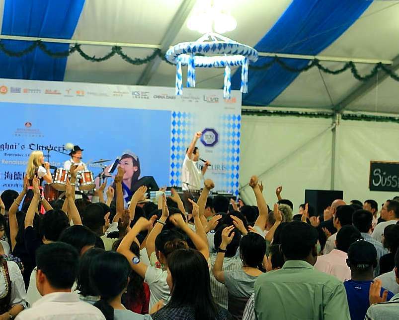 "Oans, zwoa, g'suffa!"(巴伐利亞方言“一、二、干杯!”)空前熱烈的口號響徹當(dāng)晚的會場!藍白相間大帳篷里洋溢著濃郁的德國風(fēng)情,德國的鄉(xiāng)村樂隊演奏著歡樂的祝酒歌,工作人員身著鮮艷的民族服裝穿梭在人群之中。不同膚色的中外賓客手捧酒杯,品嘗著純正的德國啤酒,興致盎然地參與各種傳統(tǒng)游戲,在音樂聲和歡呼聲中人們跨越了語言的障礙,盡情享受著節(jié)日的歡樂。