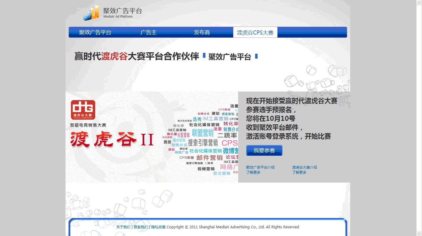 北京2011年10月11日電 /美通社亞洲/ -- 領(lǐng)先的數(shù)字廣告及增值服務(wù)提供商 MediaV 即將推出旗下全新智能精準(zhǔn)效果營(yíng)銷平臺(tái) -- 聚效廣告平臺(tái),于10月10日正式啟動(dòng)接受報(bào)名。MediaV 聚效廣告平臺(tái)(http://ju.mediav.com/duhugu )首次揭開(kāi)神秘面紗,將通過(guò)此次渡虎谷 CPS 大賽誠(chéng)邀各位廣告主及網(wǎng)站主一起感受和見(jiàn)證智能精準(zhǔn)廣告技術(shù)的魅力。