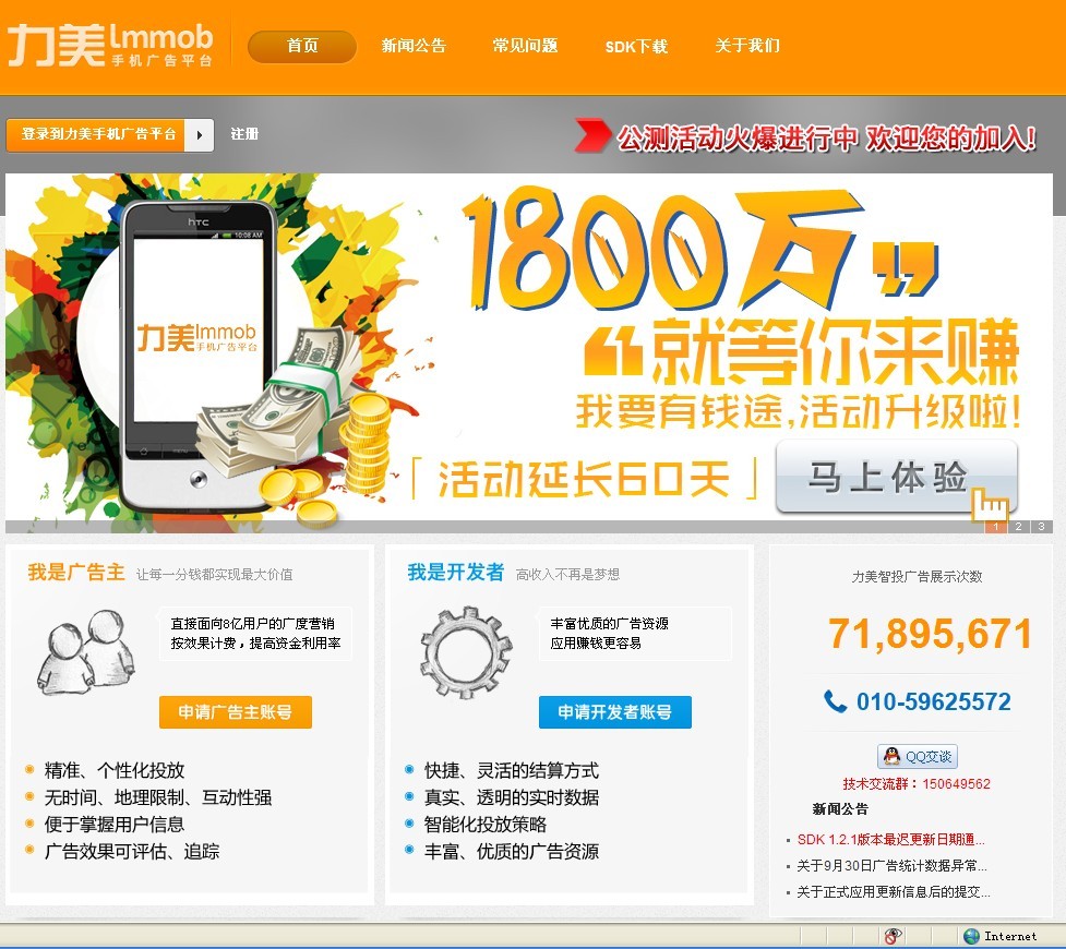 北京2011年10月24日電 /美通社亞洲/ -- 中國領(lǐng)先的移動(dòng)媒體和社交媒體營銷公司力美廣告宣布,應(yīng)廣大Android開發(fā)者的強(qiáng)烈要求,其手機(jī)廣告平臺(tái)“我要有錢途”活動(dòng)將延長至12月25日。