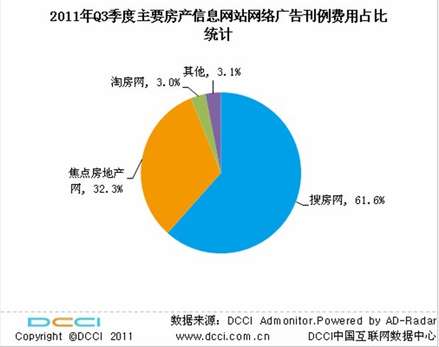 DCCI Admonitor 2011年第三季度網絡廣告投放監(jiān)測數(shù)據(jù)顯示,2011年第三季度專業(yè)房產信息網站的刊例費大都出現(xiàn)了上漲,其中搜房網的刊例費位居第一,達到1.70億元,焦點房地產網和淘房網位列二、三位;搜房網在房產信息服務網站網絡廣告總刊例費用比例達到了61.6%,遙遙領先其他網站,2011年第三季度房產信息網站的廣告投放規(guī)模出現(xiàn)了明顯的增長。
