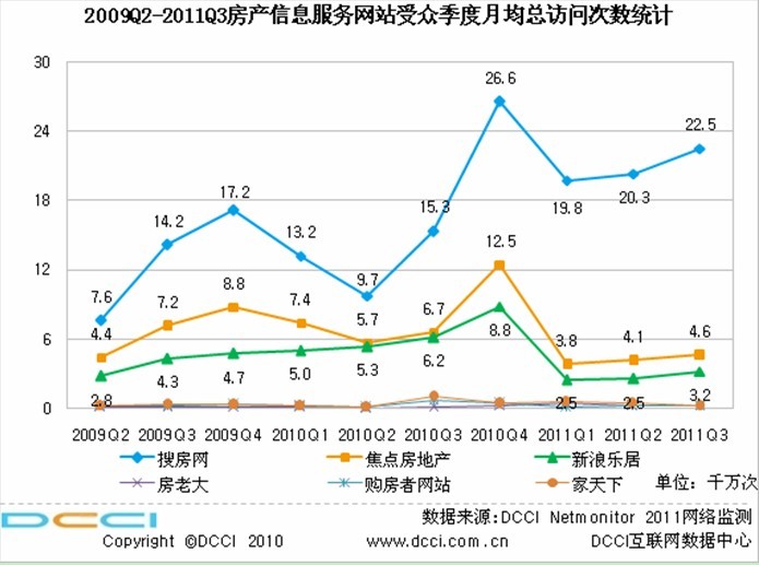 北京2011年10月24日電 /美通社亞洲/ -- DCCI 互聯(lián)網數(shù)據(jù)中心發(fā)布的《2011Q3中國房地產行業(yè)專項數(shù)據(jù)監(jiān)測報告》日前出爐。該報告分析指出,搜房網各項統(tǒng)計指標在2011年第三季度仍然保持著行業(yè)的絕對領先優(yōu)勢,與二季度相比,大量指標還有不同程度的增長。