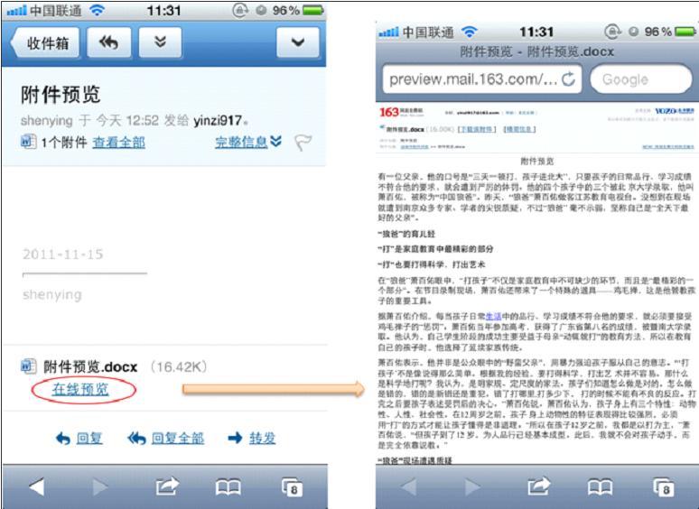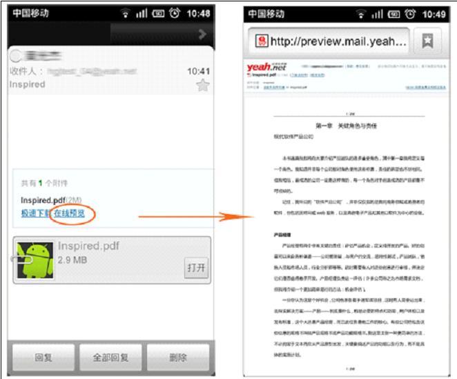 據(jù)網(wǎng)易郵箱產(chǎn)品經(jīng)理介紹,對于網(wǎng)易郵箱(163.com、126.com、yeah.net)的4.3億用戶,只要通過 IMAP 方式收取網(wǎng)易郵箱附件,不管是否安裝任何打開附件的軟件,都可以在手機(jī)和 ipad 等終端(包括 PC 客戶端、Android 手機(jī)端、iPhone 端、iPad 端的用戶)上在線預(yù)覽附件,不占用各手機(jī)和 iPad 的空間,這在國內(nèi)郵箱運(yùn)營商中屬于首創(chuàng)。