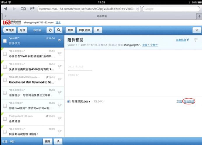 北京2011年11月30日電 /美通社亞洲/ -- 中國第一大電子郵箱服務(wù)商網(wǎng)易近日宣布,在安卓手機(jī)、蘋果手機(jī)和 iPad 上使用網(wǎng)易郵箱的用戶,可在線預(yù)覽各種格式的郵件附件,瀏覽體驗和 PC 一樣,此舉為國內(nèi)首家。