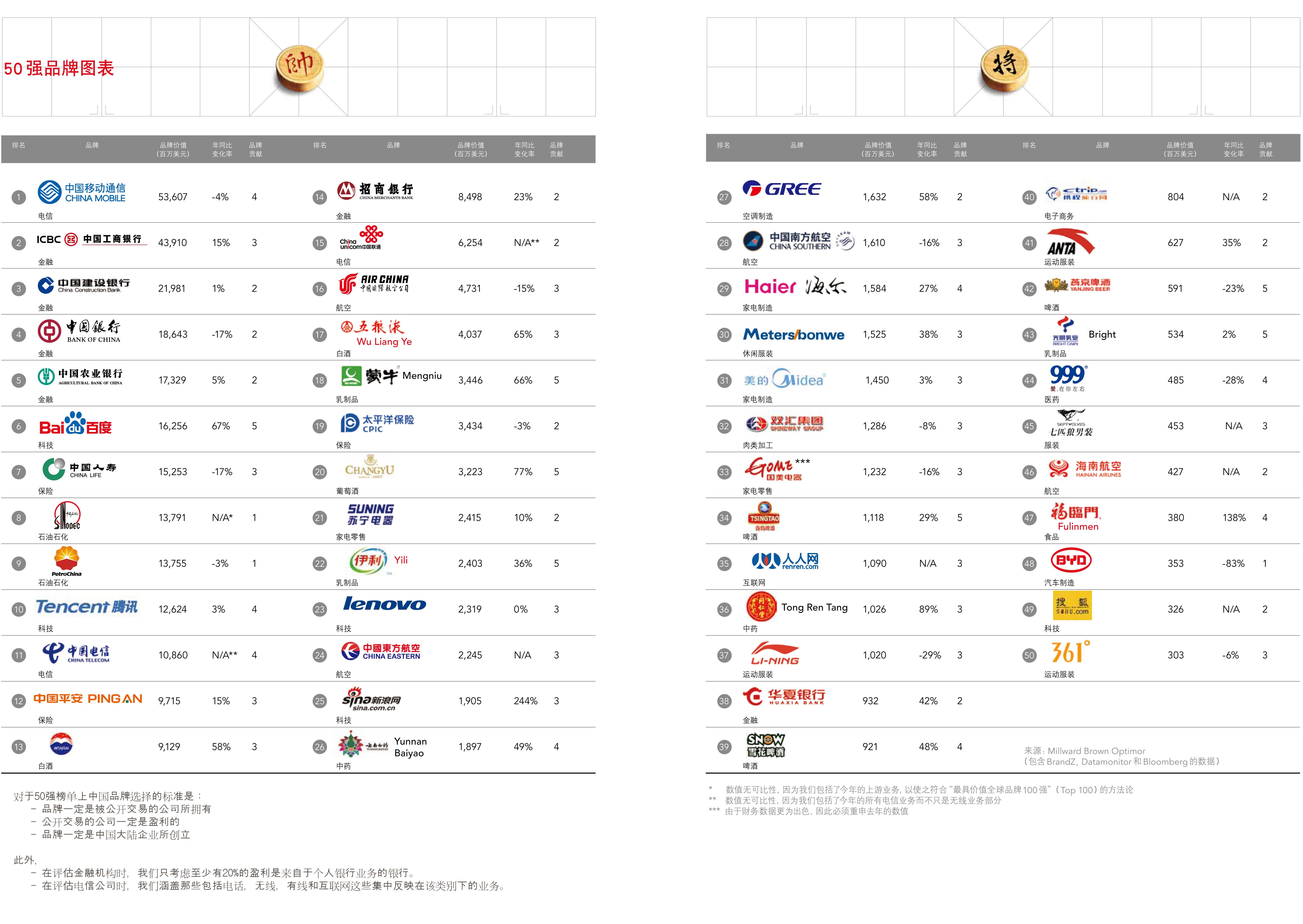 BrandZ? 最具價(jià)值中國品牌50強(qiáng)排行榜是由 Millward Brown 公司為 WPP 旗下運(yùn)營公司執(zhí)行的研究項(xiàng)目。此項(xiàng)目是唯一結(jié)合了數(shù)據(jù)超過35,000名中國消費(fèi)者的調(diào)查的品牌資產(chǎn)與對(duì)每家公司的財(cái)務(wù)及經(jīng)營成果的嚴(yán)格分析(數(shù)據(jù)來自 Bloomberg 和 KantarWorldpanel)的研究調(diào)查,分隔品牌在推動(dòng)品牌業(yè)務(wù)收入及資本市場的價(jià)值。