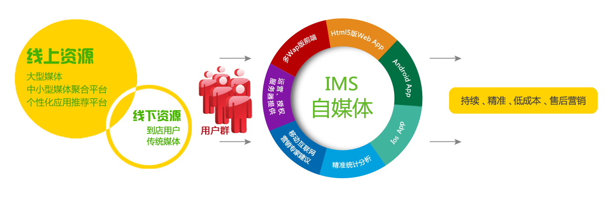 IMS系統(tǒng)的優(yōu)勢在于,其首先能給企業(yè)增加新用戶的上游資源引入,并能將引入資源轉(zhuǎn)化為會員,繼而進行持續(xù)、精準、低成本的企業(yè)“自媒體”平臺營銷;同時,該系統(tǒng)還能提供專業(yè)的托管、運營、統(tǒng)計報告、專業(yè)營銷指導等服務,為企業(yè)提供一套上中下游整體營銷服務體系。