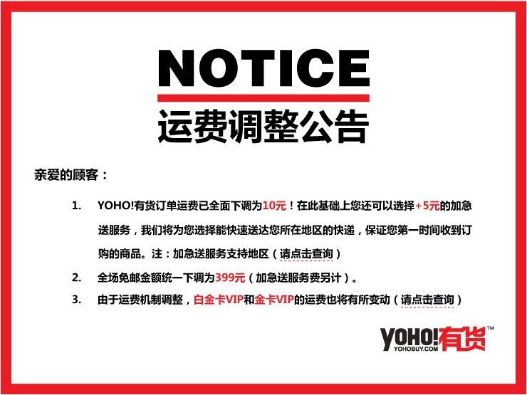 2012年起,YOHO!有貨將原來每單15元的運(yùn)費(fèi)下調(diào)至10元,購物滿一定金額可免郵的門檻也由原來的500元下調(diào)至399元。YOHO!有貨物流負(fù)責(zé)人許凱介紹:“在快遞漲聲一片的大環(huán)境下,我們承擔(dān)差價(jià)補(bǔ)貼來下調(diào)運(yùn)費(fèi),希望降低用戶潮流網(wǎng)購的門檻。在此基礎(chǔ)上,仍會保持以往優(yōu)質(zhì)的物流服務(wù),運(yùn)費(fèi)降了,服務(wù)不能降?!贬槍?jié)假日的購物高峰,YOHO!有貨還推出加急送服務(wù),從訂單審核、物流制單、揀貨包裝、分撿出庫等各環(huán)節(jié)采取優(yōu)先措施,更大程度上滿足不同用戶的物流需求。