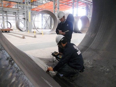 塔架作為風(fēng)電場(chǎng)關(guān)鍵的承載部件,對(duì)于風(fēng)機(jī)的安全運(yùn)行起著重要的作用。相較陸上風(fēng)電而言,海上風(fēng)場(chǎng)其條件比較特殊,如鹽霧腐蝕等惡劣的環(huán)境、海上風(fēng)機(jī)的維護(hù)不便等,使得確保風(fēng)機(jī)結(jié)構(gòu)及零部件的質(zhì)量與可靠性顯得尤為重要。SGS 此次接受龍?jiān)吹奈性谠擁?xiàng)目中提供風(fēng)機(jī)塔筒的第三方監(jiān)造服務(wù),負(fù)責(zé)生產(chǎn)過(guò)程中的質(zhì)量控制和進(jìn)度控制,深知肩上責(zé)任的重要性。SGS 檢驗(yàn)團(tuán)隊(duì)由2011年8月開(kāi)始,持續(xù)數(shù)月在江蘇如東塔架制造現(xiàn)場(chǎng)提供一系列的現(xiàn)場(chǎng)檢驗(yàn)、檢測(cè)、審核、監(jiān)督和質(zhì)量控制見(jiàn)證等服務(wù),參照歐洲海上風(fēng)場(chǎng)風(fēng)機(jī)設(shè)備質(zhì)量控制的方案,重點(diǎn)關(guān)注塔架材料的理化性能、焊接質(zhì)量、橢圓度及平面度尺寸控制、防腐處理等關(guān)鍵項(xiàng)目,從而確保58臺(tái)風(fēng)電機(jī)組符合國(guó)際質(zhì)量標(biāo)準(zhǔn)。