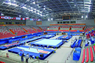 以廣州亞運(yùn)會(huì)自行車輪滑館為例,它是亞運(yùn)會(huì)自行車輪滑極限運(yùn)動(dòng)中心的核心建筑。館內(nèi)建有一條寬7.5m,長(zhǎng)250m的國(guó)際標(biāo)準(zhǔn)自行車賽道。內(nèi)場(chǎng)還可按需變換功能,包括自行車比賽熱身和裁判區(qū),輪滑場(chǎng)地賽跑道及花樣輪滑場(chǎng)地。