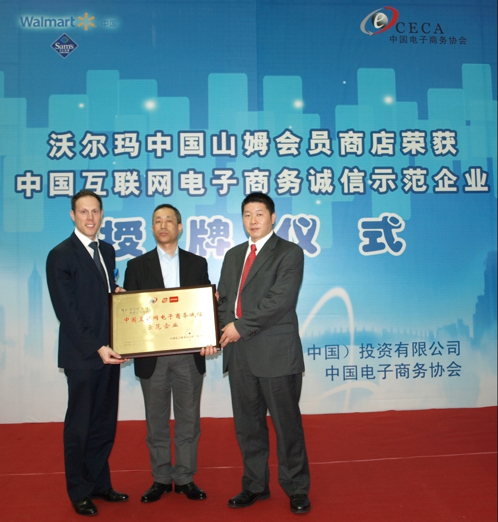 深圳2012年4月18日電 /美通社亞洲/ -- 今日,沃爾瑪中國(guó)山姆會(huì)員商店(www.samsclub.cn)被中國(guó)電子商務(wù)協(xié)會(huì)授予“中國(guó)互聯(lián)網(wǎng)電子商務(wù)誠(chéng)信示范企業(yè)”榮譽(yù)。在沃爾瑪全球年銷售額較高的深圳山姆會(huì)員商店舉行的儀式上,沃爾瑪中國(guó)副總裁兼首席信息官王曉源從中國(guó)電子商務(wù)協(xié)會(huì)萬(wàn)東輝副秘書(shū)長(zhǎng)手中接受榮譽(yù)牌匾。